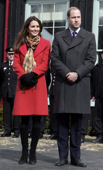 Kate menutupi perut hamilnya dengan mantel merah Armani yang dipadukan dengan syal tartan dan sepatu dari Aquatalia Rhumba. AFP Photo/Pool/Danny Lawson.